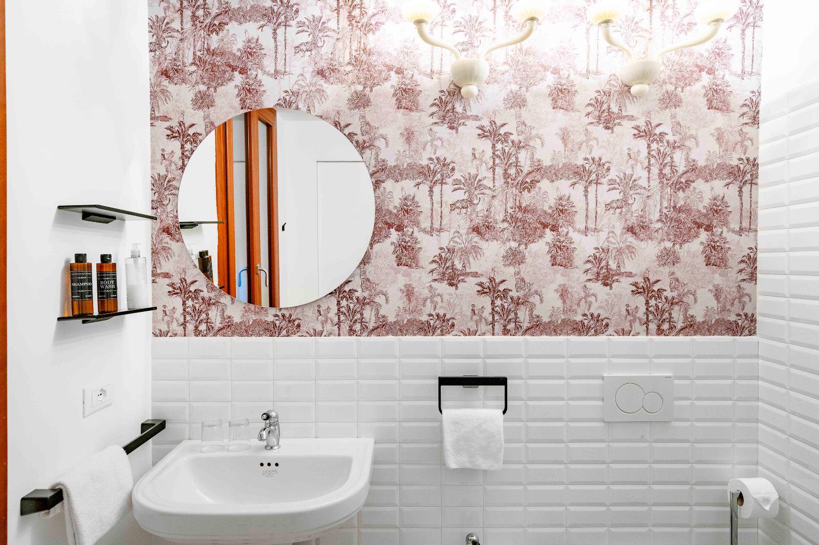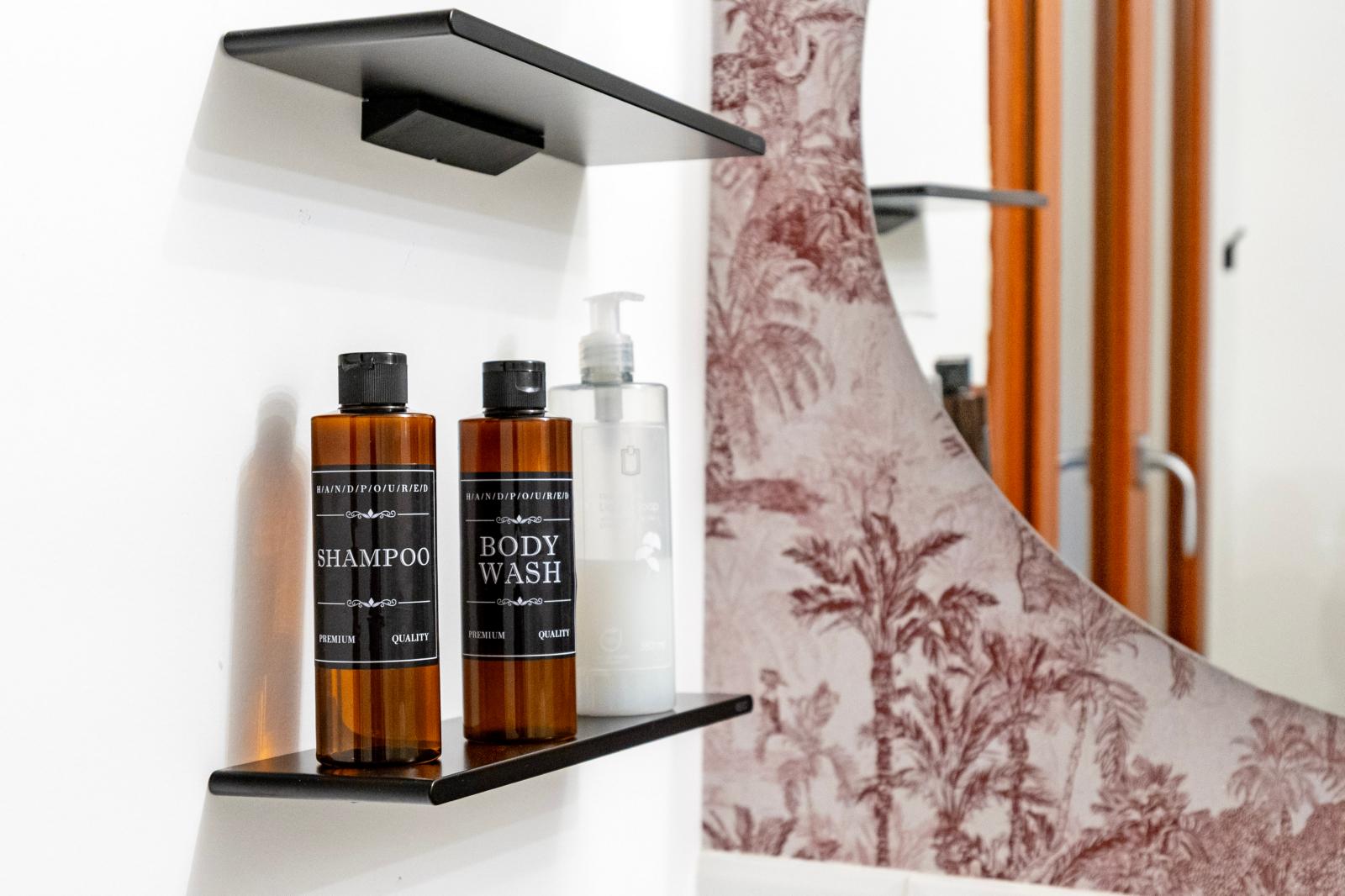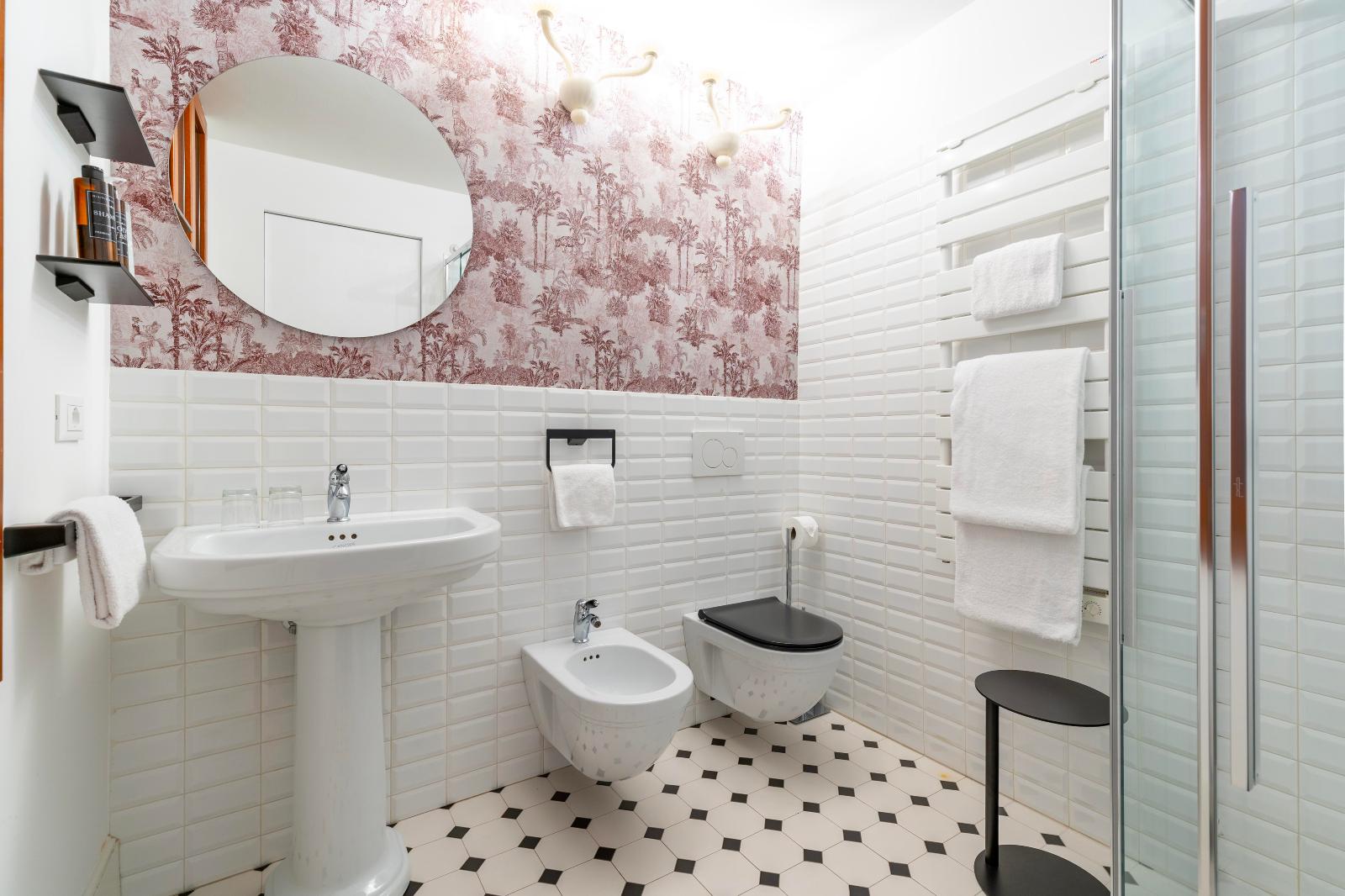 The large private bathroom features a modern shower, fresh towels, and all the essential amenities for your comfort and well-being.